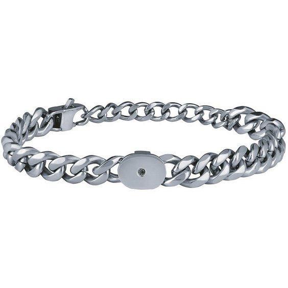 bracciale a catena in acciaio lucido con elemento centrale e diamante nero autentico. Chiusura a moschettone . Lunghezza regolabile 17-22