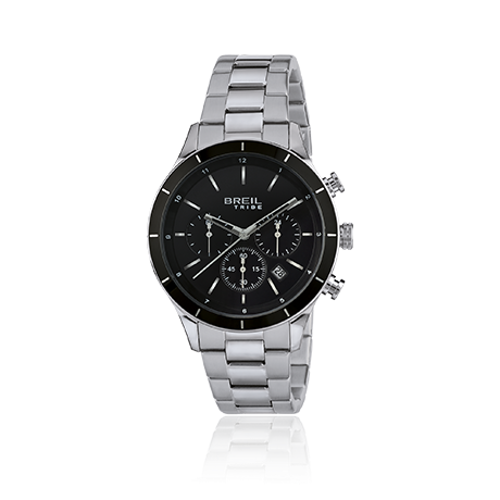 Cronografo con movimento PE 902. Cassa in acciaio 42mm. Corona e pulsanti in acciaio lucido. Lunetta nera. Quadrante nero. Contatori neri lucidi. Sfere in acciaio. Vetro minerale. Datario. W.R.: 5 atm Bracciale in acciaio. Chiusura con pulsanti e fermaglio di sicurezza.