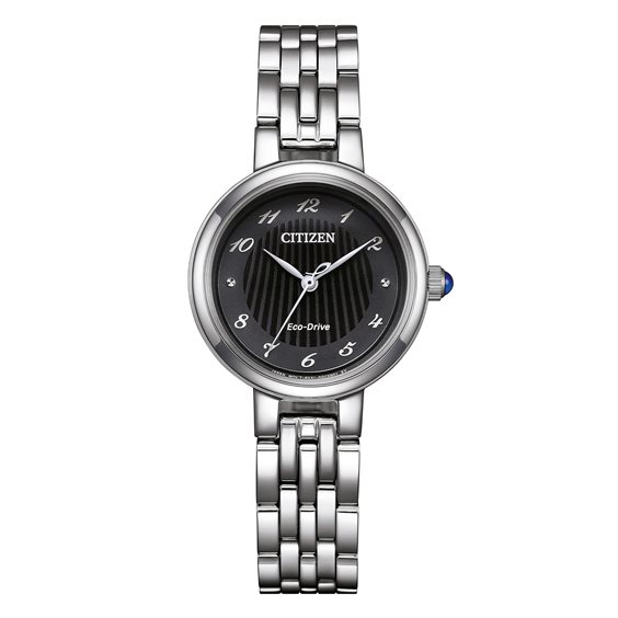 Orologio Donna solo tempo collezione Citizen Lady. Cassa in acciaio lucido, corona con pietra cabochon blu. Movimento Eco-Drive a carica luce con riserva di carica 180 giorni. Vetro zaffiro leggermente bombato. Quadrante nero cifre arabe e lancette lucide. Bracciale regolabile in acciaio lucido chiusura a farfalla con pulsanti. Impermeabile 5 bar(5 atm). Scatola e Garanzia 5 anni Originali.