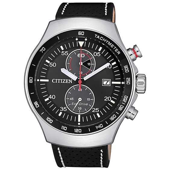 Movimento Eco-Drive a carica luce infinita con riserva di carica di 270gg. Cronografo a 1/5 sec fino a 60 minuti Cassa in acciaio Cinturino in pelle Vetro zaffiro. Fondo serrato a vite. Impermeabile 10 bar. cassa mm.43,5 quadrante nero