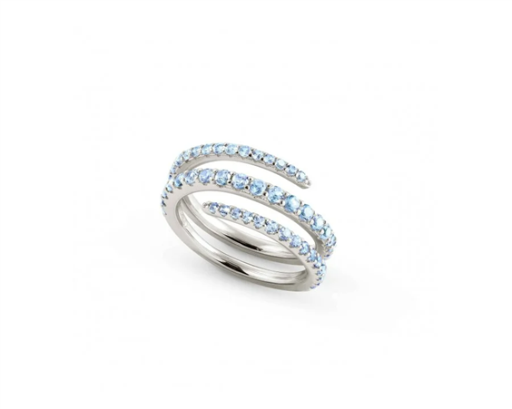 Anello in Argento 925 anallergico disponibile con rivestimento superficiale in Oro Giallo 750 o Rodio Bianco e Cubic Zirconia celeste. Altezza maglia: 0,8 cm.