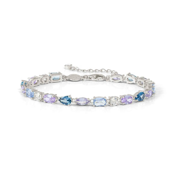 Bracciale in Argento con Cubic Zirconia di diversi tagli e differenti tonalità di colore: blu, celeste, lavanda e bianco. Disponibile con rivestimento superficiale, realizzato mediante bagno galvanico, in Rodio Bianco. Un mosaico di pietre Cubic Zirconia di forme diverse si alterna lungo tutto il bracciale. Perfetto per brillare, completa ogni tuo look in maniera unica. Tipologia Bracciali Materiale Argento rodiato bianco Lunghezza min/max 16 cm / 20 cm Pietre preziose Cubic Zirconia Colore Pietra Celeste, Blu, Bianco, Lavanda I Cubic Zirconia colorati presenti in questi articoli possono subire una lieve variazione di colore.