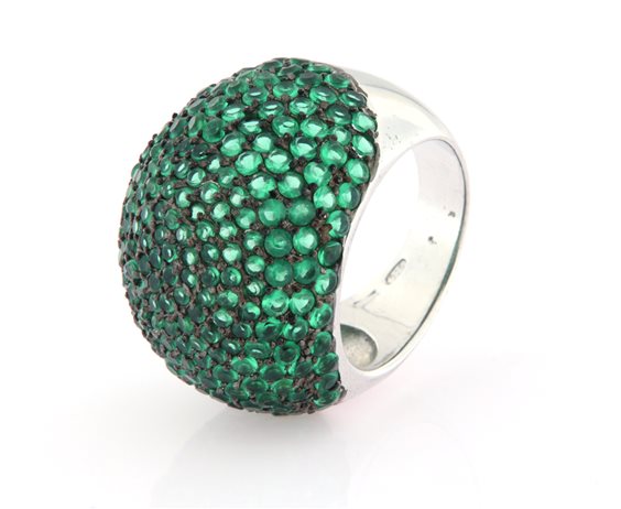 anello bombato in argento rodiato 925 con agate color verde smeraldo nella parte superiore. Misura 16