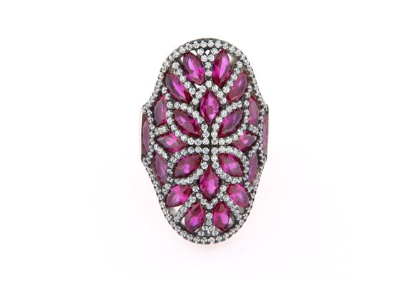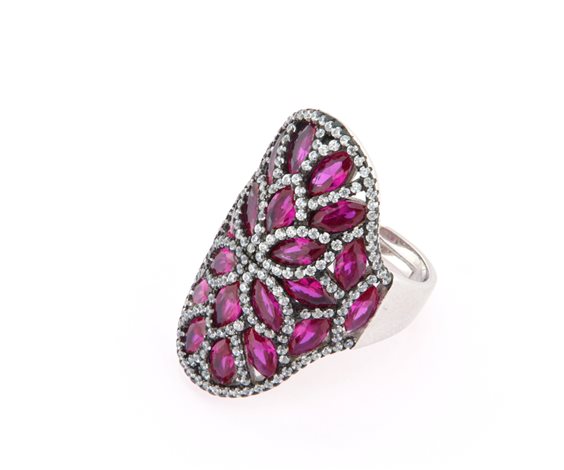 anello fascia in argento rodiato 925 con lavorazione fantasia agate rosse e zirconi. Misura regolabile