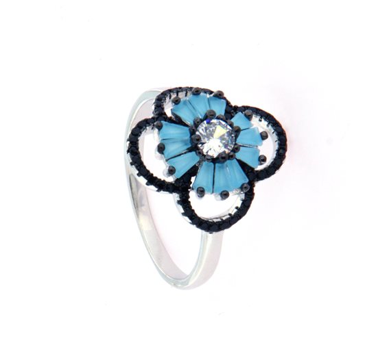 ANELLO ARGENTO 925 A FORMA DI FIORE CON MADREPERLE AZZURRE ZIRCONI NERI E CENTRALE ZIRCONE BIANCO