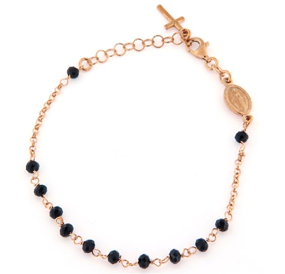 bracciale in argento 925 placcato oro rosa tipo rosario intercalato da agate nere. Lunghezza 17 + 3,5 cm.