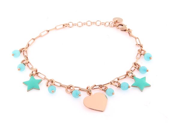 bracciale in argento 925 placcato oro rosa con agate azzurre e ciondoli smalto. Lunghezza 16,5 + 3,5 cm.