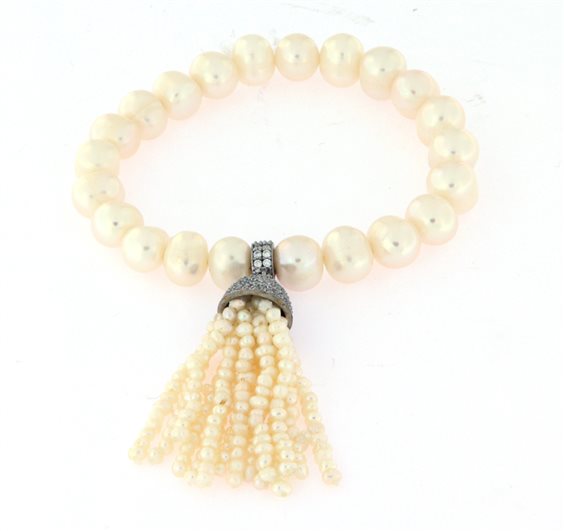 bracciale elasticizzato di perle irregolari coltivate in acqua dolce con ciondolo formato da in ciuffo di perline piccole in una coppetta pavettata di zirconi