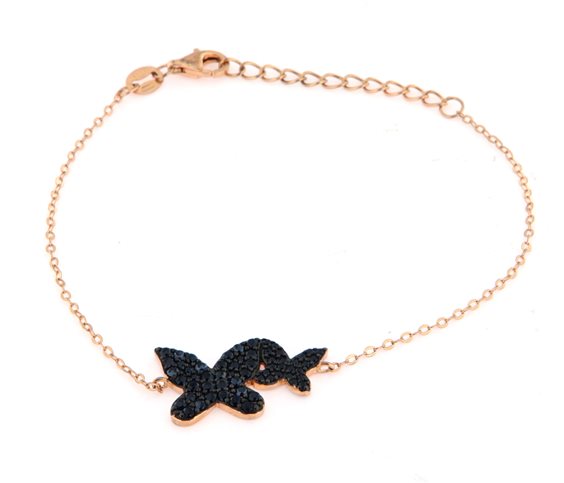 Bracciale argento 925 placcato oro rosa con zirconi neri a forma di farfalle. Lunghezza 15,5 + 3,5 cm.