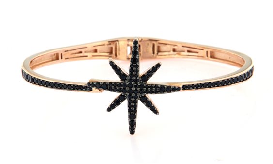 Bracciale rigido in argento placcato oro rosa con agate nere , Centrale a stella. Cerniera posteriore
