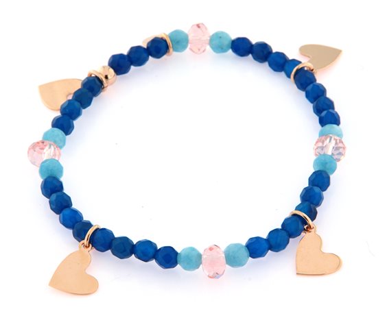 bracciale elasticizzato a sfere in agata blu azzurra con ciondoli cuore in argento 925 placcato oro rosa