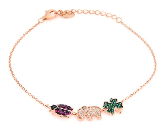 BRACCIALE CON COCCINELLA QUADRIFOGLIO E ELEFANTE ARGENTO 925 PLACCATO ORO ROSA E ZIRCONI COLORATI