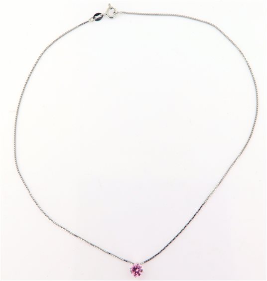 collana in argento rodiato 925 con punto luce zircone griffato di colore rosa