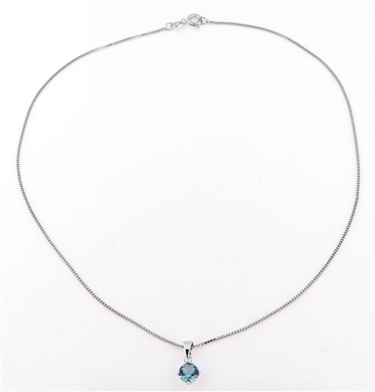 collana in argento rodiato 925 con pendente zircone tipo punto luce di color azzurro acqua marina