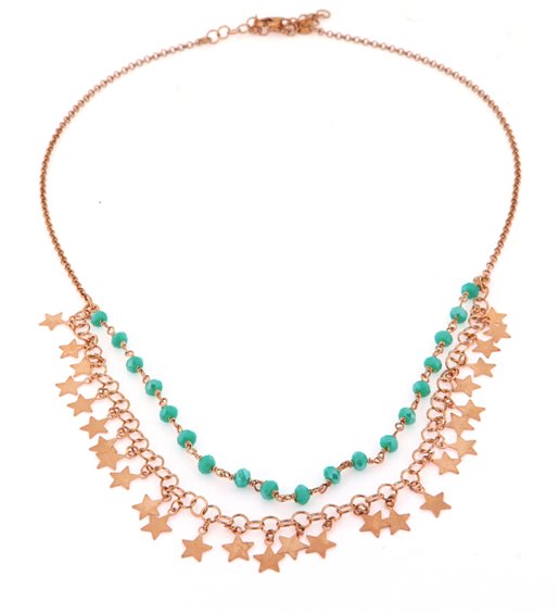 collana in argento placcato oro rosa con agate verdi e charms a forma di stelle