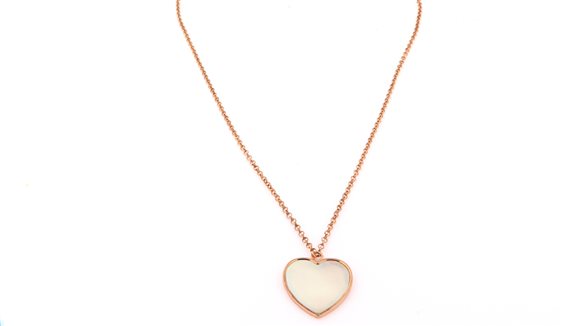 Collana lunga in argento placcato oro rosa con pendente di madreperla a forma di cuore. Dotata di chiusura con moschettone