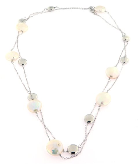 COLLANA IN ARGENTO 925% INTERVALLATA DA PERLE COLTIVATE IRREGOLARI LUNGHEZZA 90 CM CON CHIUSURA A MOSCHETTONE. POSSIBILITA' DI INDOSSO DOPPIA