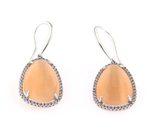 orecchino in argento 925 rodiato con quarzo cabochon di color giallo scuro. Montatura griffe con contorno di zirconi. Gambo ad amo, pietra a forma di goccia