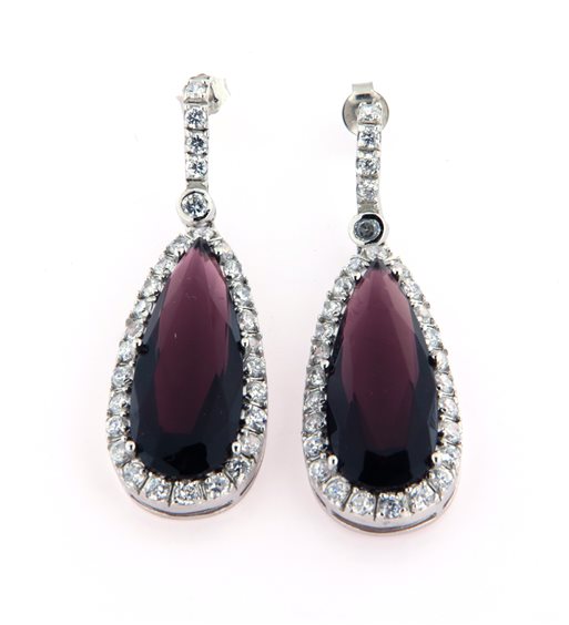 orecchini in argento 925 rodiato a forma di goccia colore viola con contorno di zirconi. Pendenti con chiusura a pressione . Lunghezza 4,2 cm