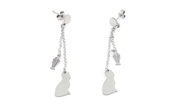 Orecchini a 2 fili in argento 925 con pendente a forma di gatto e lisca di pesce
