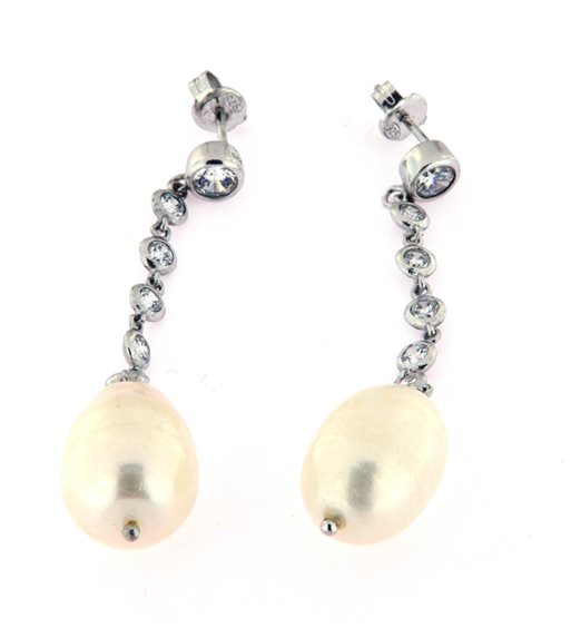 orecchini pendenti in argento 925 con zirconi e perla scaramazza . Chiusura a pressione
