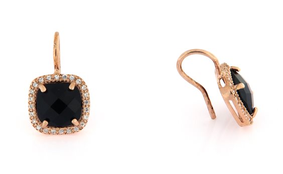 orecchini in argento 925 placcato oro rosa con agata nera e contorno zirconi. Gambo ad amo