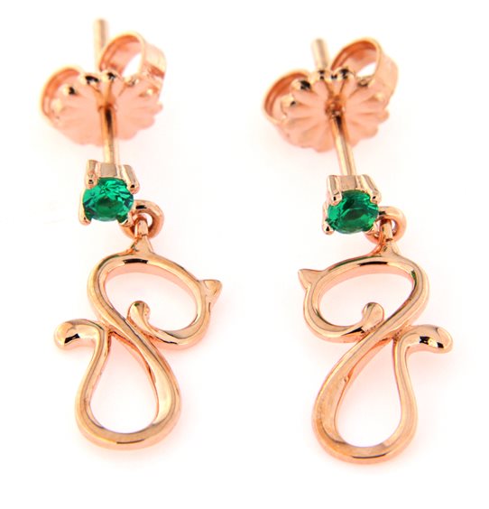 ORECCHINI ARGENTO 925 PLACCATI ORO ROSA A FORMA DI GATTO CON ZIRCONE VERDE