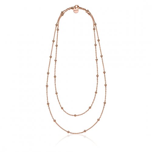 Collana lunga di catena forzatina sottile in bronzo lucido con bagno in oro rosa 24 kt decorata da piccole sfere distanziate. Chusura con moschettone e medaglietta con logo UNOAERRE. Semplicità ed eleganza senza tempo in una raffinata rivisitazione. L'accessorio perfetto da indossare tutte le volte che vuoi. Lunghezza 120,00 cm.