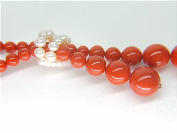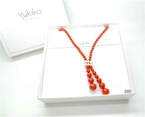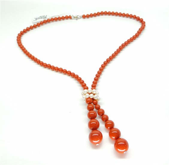 collana cm 55 escluso il pendente tipo cravatta di cm 7 . pasta di corallo e perle coltivate a scalare da mm 14 a mm 5. liscio al tatto, elegante da indossare, sentirsi bene con oggetti di raffinata bellezza ascoltare queste note di colore indossare la moda. scatola e garanzia del negoziante regolarmente timbrata, shopper per completare tuo nuovo acquisto.